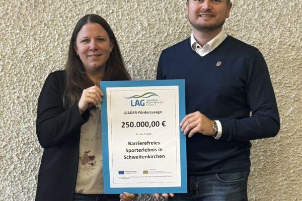 Das Projekt „Barrierefreies Sporterlebnis in Schweitenkirchen“ kann offiziell starten. Nach nur rund drei Monaten Bearbeitungszeit übergab Tina Schuler, Managerin der Lokalen Aktionsgruppe (LAG) Landkreis Pfaffenhofen, den Bewilligungsbescheid an Bürgermeister Josef Heigenhauser. Die Gemeinde erhält vom europäischen LEADER-Programm eine Förderzusage in Höhe von 250.000 Euro für ihr Vorhaben.