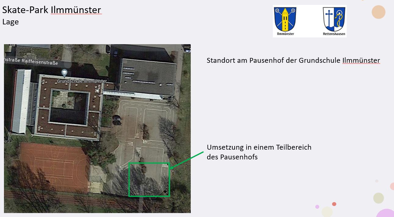 Auf einer Teilfläche des Pausenhofs der Grundschule Ilmmünster soll für alle, vor allem aber für die Kinder und Jugendlichen der Gemeinden Ilmmünster und Hettenshausen ein Skate-Park als attraktive Möglichkeit zur Freizeitgestaltung entstehen. In Bau und Konzeption sollen sowohl die Kinder und Jugendlichen als auch engagierte Bürgerinnen und Bürger soweit wie möglich einbezogen werden und „mitgestalten“ können. Die Idee zum Skatepark kam von Jugendlichen aus Ilmmünster, der sich dann auch die Jugend aus Hettenshausen anschloss.