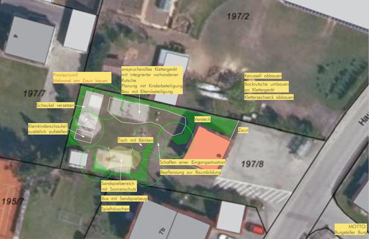 Im Ortsteil Burgstall ist aufgrund der Bürgerbeteiligung ein Spielplatz für Kinder aller Altersgruppen mit dem Thema „Burg“ geplant. Im Ortsteil Gosseltshausen ergab der Bürgerbeteiligungsprozess die Verlagerung des vorhandenen Spielplatzes und die Ausstattung mit einer Seilbahn, eines Wipp-Spielgeräts für Kleinkinder sowie einem Pavillon als sozialem Treffpunkt für alle Generationen. Die Umsetzung an diesem Standort ermöglicht zudem die Durchführung von Veranstaltungen für die ortsansässigen Vereine.