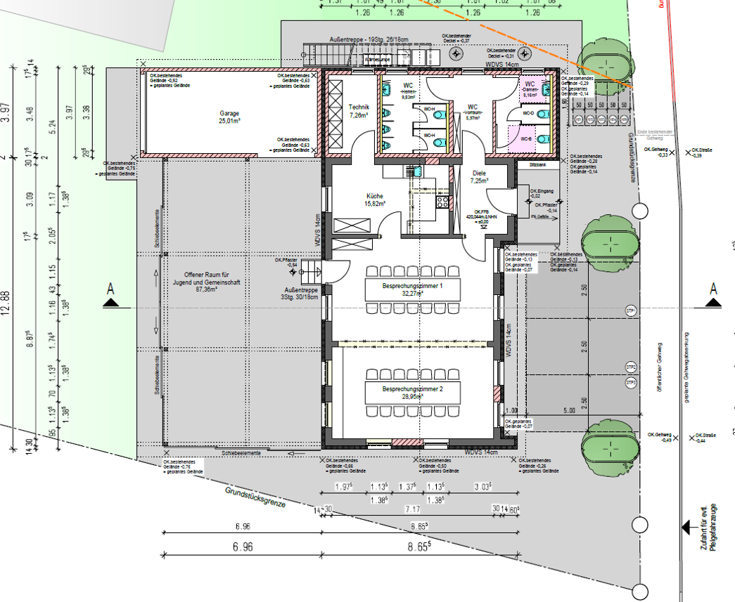 Deshalb soll eine Trennmauer eingezogen werden und anschließend das „Theater-Drittel“ zu einem dauerhaftem Veranstaltungsraum um- und ausgebaut werden. Sanitäre Anlagen, ein Catering-Bereich, ein Umkleideraum und ein Aufführungsraum sollen neu geschaffen und die bestehende Heizung erneuert werden.